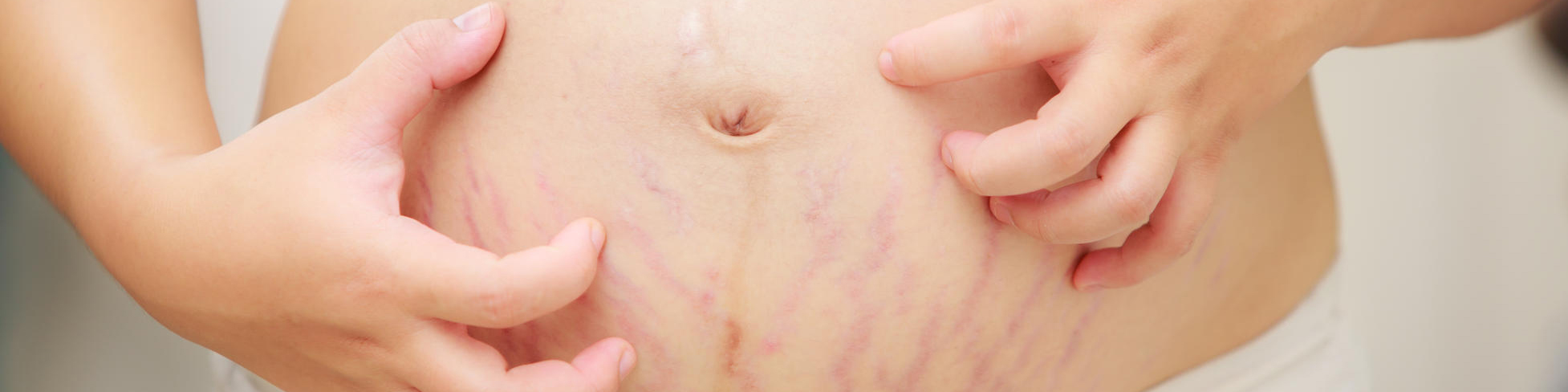 • 由皮疹樣小點組成的皮疹,通常從妊娠紋區域散開,不延伸至乳房