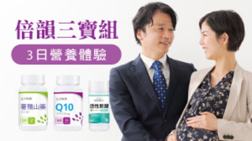 熟齡、檢查數值不佳準備懷孕,妳需要孕前90天營養準備關鍵期,提供妳活力媽媽倍韻三寶組專屬維他命:薯蕷山藥、Q10、活性葉酸3日份體驗,,幫助您調理體質。