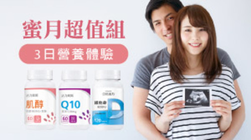 孕前想孕育絕佳環境?妳需要90天營養準備關鍵期,提供妳活力媽媽蜜月超值組專屬維他命:肌醇、Q10、維他命D3日份體驗,幫助您調理體質。